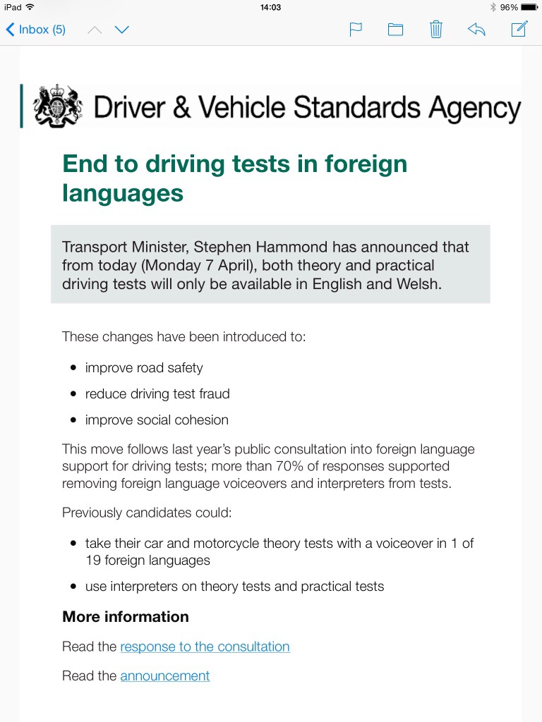 As a reminder: From Monday you will only be allowed to take your Theory & Driving Test in English.